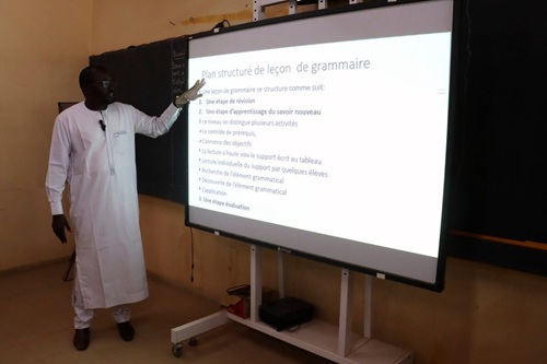 Après la traditionnelle montée des couleurs accompagnée des hymnes du Niger et de l'AES, Dr Elizabeth Shérif a lancé l'enregistrement des leçons structurées, avant de visiter la salle numérique où le directeur de la formation initiale et continue lui a expliqué comment se déroule le Canevas des leçons de grammaire, orthographe et de conjugaison.